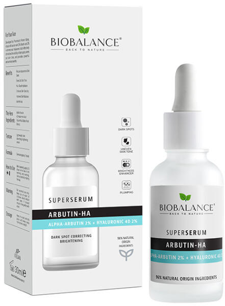 Biobalance szuperszérum arcra arbutinnal és 4d hialuronsavval 30 ml 2% ALFA-ARBUTIN ÉS 2% 4D HIALURONSAV Könnyű, gyorsan beszívódó, ragyogást fokozó szérum. Sötét foltok korrigálására. 96%-ban természetes eredetű összetevőket tartalmaz. Dermatológiailag tesztelt. Illatanyagmentes Tartósítószer-mentes Színezékmentes Petrolátum (vazelin)-mentes Szilikonmentes Ásványi ola