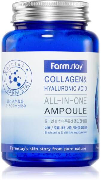 Farmstay Collagen & Hyaluronic Acid All-In-One Ampoule, 250 ml, arc szérumok nőknek, Úgy érzi, hogy bőrének többre van szüksége, mint amit a krémek nyújtanak? A kiváló Farmstay Collagen & Hyaluronic Acid All-In-One Ampoule arcszérum tökéletes kiegészítője bőrápolási rutinjának – kényezteti és intenzív ápolásban részesíti bőrét. A magas hatóanyag-koncentr