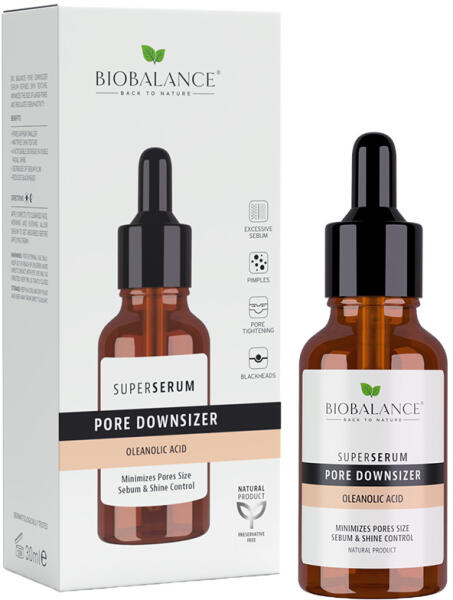Biobalance szuperszérum arcra pórusösszehúzó oleánollsavval 30 ml Minimalizálja a pórusok méretét, szabályozza a faggyútermelést és a bőr olajos fényességét. Dermatológiailag tesztelt. Pórusösszehúzó szuperszérum, emulzió, mely finomítja a bőr textúráját, minimalizálja a nagyobb pórusok méretét és szabályozza a faggyútermelést. 99%-ban természetes eredetű ö