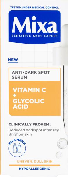 Mixa sötét foltok elleni szérum egymást kiegészítő aktív összetevőkkel gazdagítva: Cg-vitamin és glikolsav. Az érzékeny bőrre kifejlesztett Cg-vitamin a bőr ragyogásának javításáról ismert. A glikolsav - AHA sav - gyengéden hámlasztja a fakó bőrt, hogy elősegítse az egyenletesebb bőrtónus kialakulását.