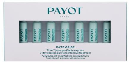 A PAYOT Pte Grise 7-Day Purifying Intensive Treatment egy hétnapos cinkes kúra kombinált és pattanásra hajlamos arcbőr tisztítására. A Pate Grise ampullás arctisztító hatásai megszabadítja az arcbőrt a nem kívánt faggyútól, mélyen tisztítja a pórusokat és összehúzza őket, lágyítja az arcbőr felszínét, a cinknek köszönhetően antibakteriális hatása van, az összet