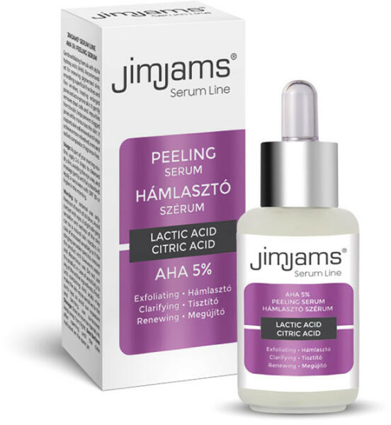 Gyengéden hámlasztó formula alfa-hidroxi-savakkal (AHA). Ajánlott pigmentfoltos bőrfelszín megújítására, felületi, finom ráncok simítására, tág pórusokra, valamint pattanásos bőr ápolására. JimJams Serum Line AHA 5% hámlasztó szérum (30 ml) HámlasztóTisztítóMegúj ítóGyengéden hámlasztó formula alfa-hidroxi-savakkal (AHA). Ajánlott pigmentfoltos bőrfelszín meg