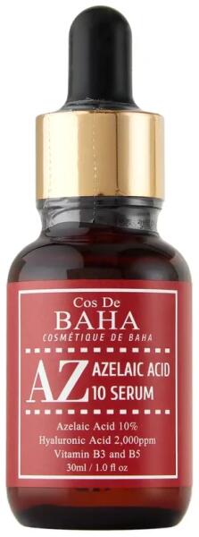 Gyulladáscsökkentő szérum azelainsavval Cos De BAHA AZ Azelaic Acid 10 Serum hatékonyan kezeli a pattanásokat, mitesszereket és aknét, valamint megszünteti a gyulladások okát. A termék halványítja a pattanások után maradt foltokat, egyenletesebbé teszi a bőr textúráját, visszaadja rugalmasságát, és egészséges, egységes tónust biztosít. Hatékony a hiperpigmentáció é