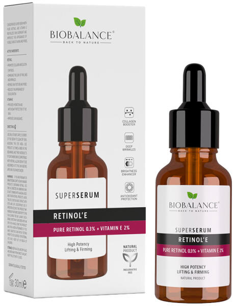 Biobalance szuperszérum arcra retinol 30 ml Vízmentes szérum. Hatékony feszesítő. Dermatológiailag tesztelt. Koncentrált szuperszérum tiszta retinollal és E-vitaminnal, mely az éjszaka folyamán revitalizálja a bőrt és javítja a pórusok és az öregedés látható jeleinek megjelenését. 97%-ban természetes eredetű összetevőket tartalmaz. RETINOL: Támogatja a bőr kollagén-