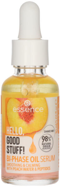 Transparent - az essence hello, good stuff! bi-phase oil serum friss barackillatával nem csak az érzékeket kelti életre, hanem szórakoztató is: óvatosan rázza fel, amíg mindkét fázis összekeveredik. Az őszibarackvíz és a peptidek kombinációja hidratál, kellemes érzetet és sima bőrt biztosít. és ami a legjobb: az összetevők 98%-ban természetes eredetűek. Jót tesz önnek,