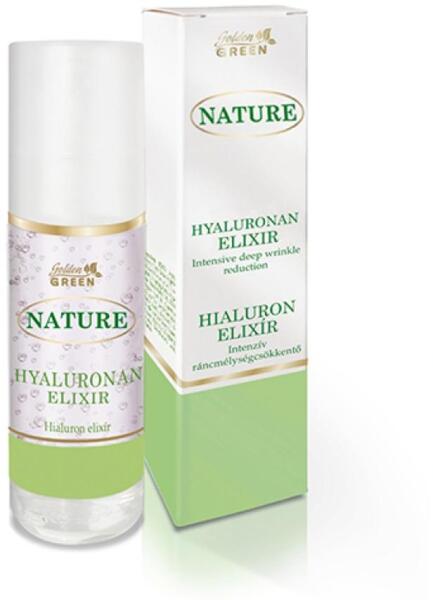 Golden Green Nature Hialuron elixír 10% intenzív ráncmélység csökkentő, 30 ml- Új intenzív ránctalanító és hidratáló elixír a Golden Green kínálatában 10%-os koncentrációval - A Golden Green Nature Hialuron elixír természetes növényi hialuron nagy koncentrációjának segtségével csökkenti a már kialakult ráncok mélységet - Megköti az arcbőr nedvességét, nem eng