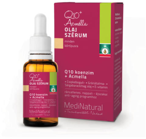 Mit tartalmaz a Medinatural Q10 -acmella olaj szérum? Q10 koenzim Tudományos kísérletek sora igazolja, hogy a Q10 koenzimnek szerepe van a sejtek anyagcsere folyamataiban és akadályozza a káros szabadgyökök keletkezését. Lassítja a bőr öregedését, ám az életkor előrehaladtával a szervezet egyre kisebb mennyiségben tudja előállítani, ezért külső pótlása szükséges. A M
