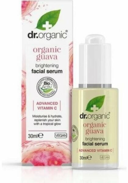 ArcápolásDr. Organic Guava Brightening arcszérum, 30 ml- Tápanyagokban gazdag kiegészítő bőrápoló - A Guava gyümölcs C-vitaminban gazdag, segítségével az arcszérum hidratálja, feltölti a bőrt és ragyogást kölcsönöz számára - Természetes összetevői az Aloe vera, shea vaj, napraforgómag olaj, kókuszolaj és a kakaómag vaj melyek erejével segít feltölteni a fáradt,