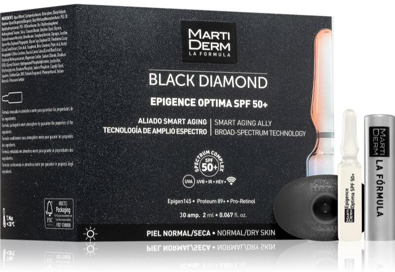 MartiDerm Black Diamond Epigence Optima SPF 50+, 30x2 ml, arc szérumok nőknek, Úgy érzi, hogy bőrének többre van szüksége, mint amit a krémek nyújtanak? A kiváló MartiDerm Black Diamond Epigence Optima SPF 50+ arcszérum tökéletes kiegészítője bőrápolási rutinjának – kényezteti és intenzív ápolásban részesíti bőrét. A magas hatóanyag-koncentrációnak köszönhet