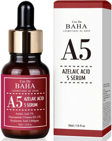 A Cos De BAHA A5 Azelaic Acid 5% Serum [30ml] egy gyengéd, de hatékony szérum, amely 5% azelainsavat tartalmaz, hogy segítsen kezelni a bőrpírt, a pattanásokat és a hiperpigmentációt. Az azelainsav gyulladáscsökkentő és antibakteriális tulajdonságai révén hozzájárul a tiszta, egyenletes bőrtónus eléréséhez, miközben minimalizálja a pórusokat és szabályozza a faggyúte