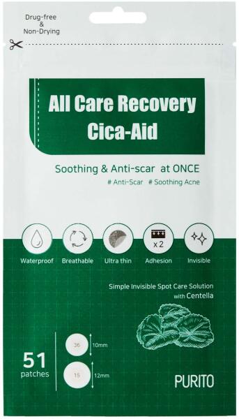 A Purito All Care Recovery Cica-Aid nélkülözhetetlen segítője lesz a bőrhibák kezelésében. Ezek a színtelen tapaszok olyan hatóanyagok kiegyensúlyozott kombinációját tartalmazzák, mint az asiaticoside, a madecassoside és az asiatic sav, amelyek hatékonyan küzdenek a bőrhibák ellen, regenerálják a bőrt és csökkentik a pigmentfoltok láthatóságát.