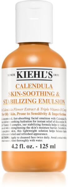 Kiehl's Calendula Skin-Soothing & Stabilizing Emulsion, 125 ml, helyi ápolás nőknek, Tulajdonságok: mérsékli az arcbőr kipirosodását elnyomja az akne tüneteit csökkenti a túlzott faggyútermelést csökkenti a bőrhibákat visszaadja a bőr üdeségét nem tömíti el a pórusokat nem vált ki zsíros érzést Használata: Vigye fel a megtisztított arcbőrére és körkörös mozd