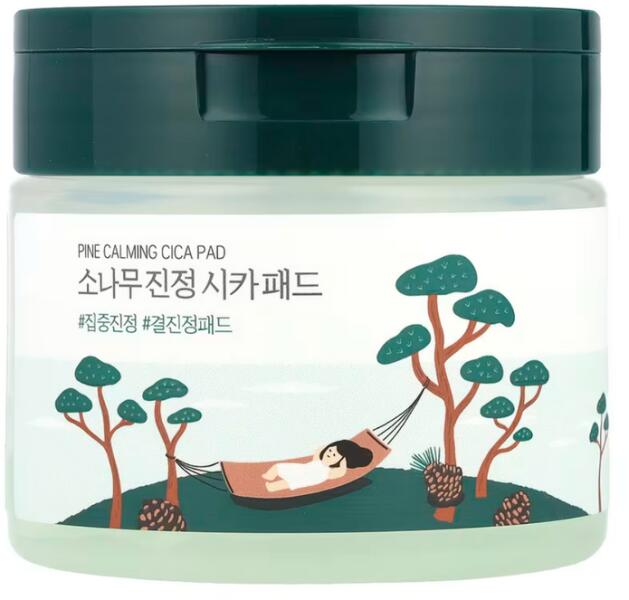 A Round Lab Pine Calming Cica Pads azonnali bőrnyugtatást és hidratálást nyújt, fenyőfa tűleveléből és centella asiatica-ból származó összetevőkkel, amelyek hatékonyan nyugtatják az irritált bőrt. A hialuronsavval dúsított tonizáló párnák mélyen hidratálják a bőrt. Nagy méretű (7cm átmérő) párnák könnyen használhatók az egész arcon és duo-oldalas kialakít