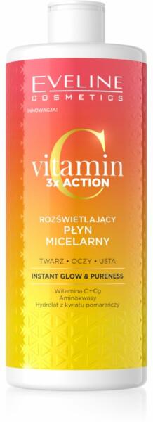 Eveline Cosmetics Vitamin C 3x Action, 500 ml, Bőrtisztítás nőknek, Az apró aktív részecskékkel gazdagított Eveline Cosmetics Vitamin C 3x Action micellás víz a bőrrel érintkezve minden szennyeződést és zsírt magához vonz. Ezeknek a micelláknak köszönhetően a víz alapos sminkeltávolítást biztosít néhány perc alatt, nyomkodás vagy dörzsölés nélkül. A micellák oly