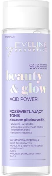 Eveline Cosmetics Beauty & Glow Acid Power!, 200 ml, arctonikok nőknek, Az arctisztítás és az azt követő bőrápolási rutin közötti átmenet ugyanolyan fontos, mint maga a tisztítás. A kiváló Eveline Cosmetics Beauty & Glow Acid Power! tonik ezen folyamatok egyes lépéseit nagyszerűen összeköti, és a bőrápolást még hatékonyabbá teszi. Gondoskodik a bőr alapos megti