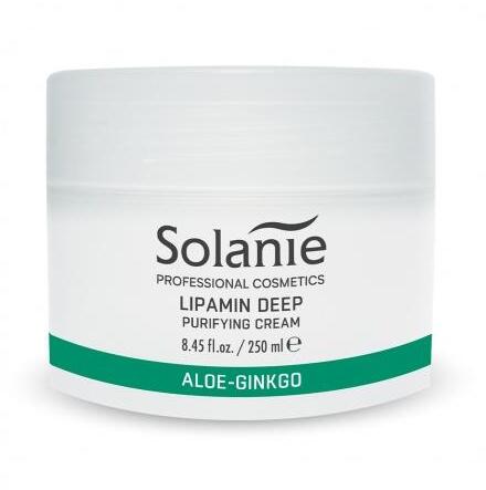 Solanie Aloe Gingko Lipamin mélytisztító krém, 250 ml- Fő öszetevői az aloe, ginkgo kivonatok, allantoin, szőlőmagolaj, lipoaminosav - Az érzékeny, nehezen tisztítható bőrtípusokhoz is megfelő kezelés - A pórusokba rakódott szennyeződések, tökéletes eltávolítására készült - A lipoaminosav egy bőrbarát, felületaktív anyag a bőr fiziológiai mélytisztítását vég