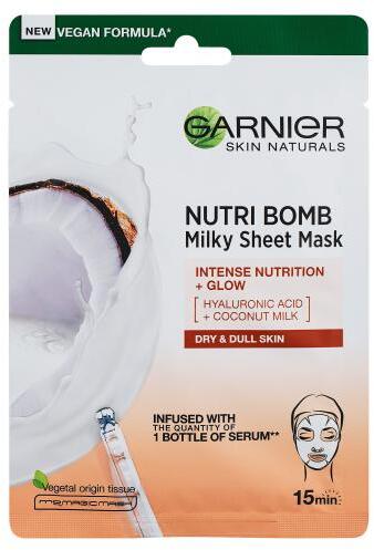 A Garnier Skin Naturals Nutri Bomb Coconut + Hyaluronic Acid tápláló és bőrélénkítő fátyolmaszk kókusztejet tartalmaz, amely intenzíven hidratálja az arcbőrt, a benne levő hialuronsav pedig mélyen hidratálja.