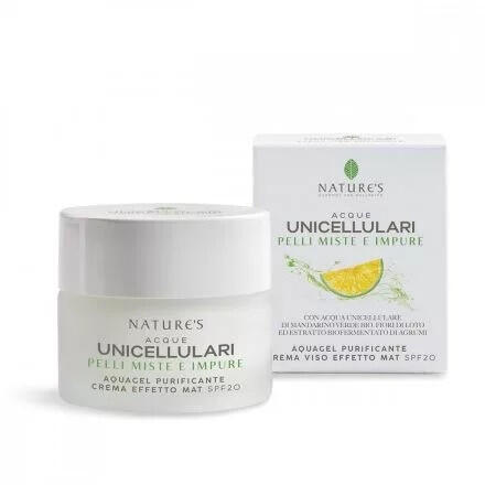 Nature's tisztító hatású gélkrém SPF20, 50 ml - Matt gélkrém- Könnyű és bársonyos, kiegyensúlyozó hatást fejt ki a bőrhibák és a tisztátalan bőr ellen- Frissítő és összehúzó hatású bio unicelluláris zöldmandarin-vizet, valamint nyugtató és antioxidáns tulajdonsággal rendelkező lótuszvirág-kivonatot tartalmaz, amelyek segítenek a külső hatások elleni védeke