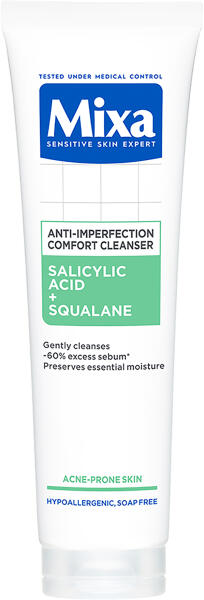 A Mixa bőrhibák elleni tisztító gél szalicilsavval és szkvalénnel eltávolítja a többlet faggyút és a sminket, illetve megszépíti a bőr textúráját. A szalicilsav eltávolítja a szennyeződéseket, a szkvalén pedig megőrzi a szükséges nedvességet. Használat