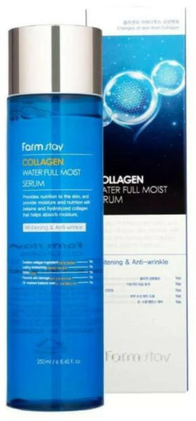A Farmstay Collagen Water Full Moist óriási méretű (250 ml) széruma nagy koncentrációban tartalmaz kollagént és aktív növényi összetevőket, amelyek nemcsak hatékonyan regenerálják a sejteket , hanem megakadályozzák az öregedési elváltozások megjelenését . A tengeri kollagén eltünteti a ráncokat , csökkenti a szövetek duzzanatát, puhává teszi a bőrt , és segít me