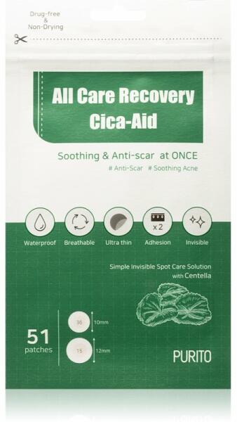 Purito All Care Recovery Cica Aid, 51 db, helyi ápolás nőknek, A minőségi Purito All Care Recovery helyi ápoló gondoskodik az arcbőr problémás helyeinek kezeléséről, közben pedig nyugtatja az irritáltságát és támogatja a természetes regenerálódását. Tulajdonságok: helyileg kezeli a problémás arcbőr tüneteit mérsékli az arcbőr kipirosodását elnyomja az akne tünete