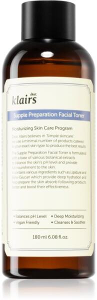 Klairs Supple Preparation Facial Toner, 180 ml, arctonikok nőknek, Az arctisztítás és az azt követő bőrápolási rutin közötti átmenet ugyanolyan fontos, mint maga a tisztítás. A kiváló Klairs Supple Preparation Facial Toner tonik ezen folyamatok egyes lépéseit nagyszerűen összeköti, és a bőrápolást még hatékonyabbá teszi. Gondoskodik a bőr alapos megtisztításáról, e