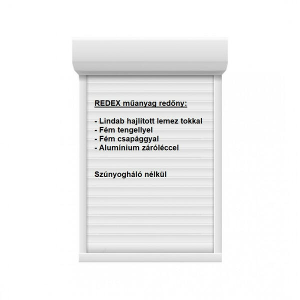 REDEX műanyag redőny (lindab hajlított lemez tokkal, műanyag lefutóval) - szúnyogháló nélkül Kizárólag rendelésre, egyedi méretre készített műanyag redőny. Aktuális szállítási határidőről a főoldalon tájékozódhat. Mit tartalmaz a termék csomag, amit kézhez kap: Az Ön által megadott egyedi szélességű és magasságú redőnyt kompletten összeszerelve. A redőny t