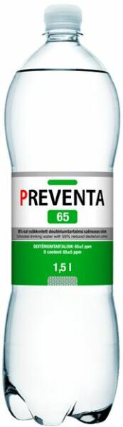 Preventa 65 1,5l csökkentett deutériumtartalmú mentes víz (visszaváltható, Betéti díjas +50. -Ft) A Preventa®-65 csökkentett deutériumtartalmú ivóvíz betegek esetében a hagyományos terápiák mellett kiegészítő jelleggel alkalmazható. A kúra időtartama alatt egyéb folyadékok fogyasztása csak korlátozott mennyiségben javasolt. A napi mennyiséget (általában 1,5–2 lite