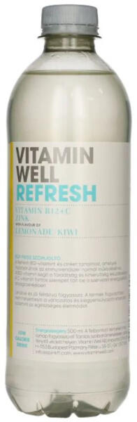 Vitamin Well refresh üdítőital 500 ml Prémium minőségű, szénsavmentes energiaszagény üdítőital Limonádé-Kiwi ízben. Gazdag különféle Vitaminokban és ásványi anyagokban. Növényi- és gyümölcskivonatokat tartalmaz. Gyümölcscukorral enyhén ízesített. Alacsony kalóriatartalmú (85 kcal/palack). C-, B-12 és E-vitamint valamint Cinket és Folsavat együttes kombinációja