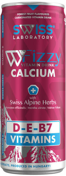 SWISS FIZZY KALCIUM+D3 VITAMIN ITAL 250ML szénsavas Fogyasztását hűtve ajánljuk! Erdei gyümölcsös ízű szénsavas vitaminital A Fizzy Kalcium italban a 400 mg kalcium-ot töltünk, amely a felnőtt napi beviteli referencia érték fele. Mindez megtámogatva D3-vitaminnal, E-vitaminnal és Biotin-nal, amelyből az italban szintén felnőtt napi beviteli referencia érték 50%-a van. A kalc