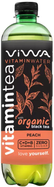 Viwa vitamintea black tea peach 600 ml Összetevők: organikus fekete teával készült vitamintea, sztéviával és szukralózzal édesítve, hozzáadott vitaminokkal, őszibarackos ízben