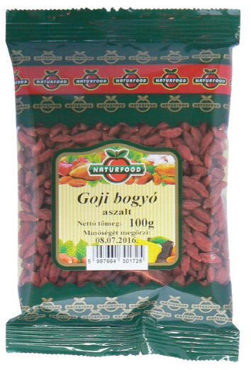 Cukor hozzáadása nélkül készült aszalt goji bogyó. Fogyasztható közvetlenül csemegeként, felhasználható müzlik, joghurtok ízesítésére, sütemények készítéséhez. 100 g-os aszalt goji bogyó; Naturfood termék az egészséges élelmiszerek kedvelőinek.