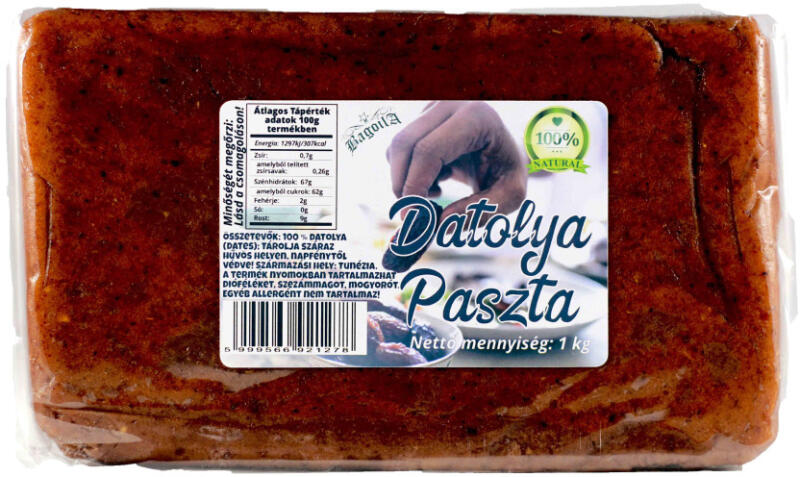 Bagoila datolya paszta 1000 g Datolya Paszta, 100 % datolyából készült termék. A datolya természetes cukortartalmától édes ízű. Tökéletes édesítésre, süteményekhez, de önmagában fogyasztva is. Összetevők: 100 % datolya