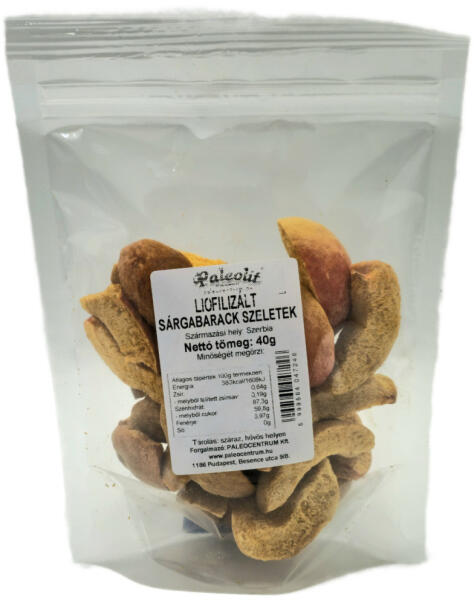 Liofilizált sárgabarack szeletek 100% liofilizált gyümölcs. Az egyetlen dolog, ami hiányzik belőle az a víz. Semmilyen adalékanyagot illetve tartósítószert nem tartalmaz. Nincs benne hozzáadott cukor, olaj vagy kén. GMO és gluténmentes, viszont rostban és tápanyagban gazdag. Mivel nincs hőkezelés, a gyümölcsök a tápanyag tartalmuknak több mint 90%-át megtartják. Kellemes