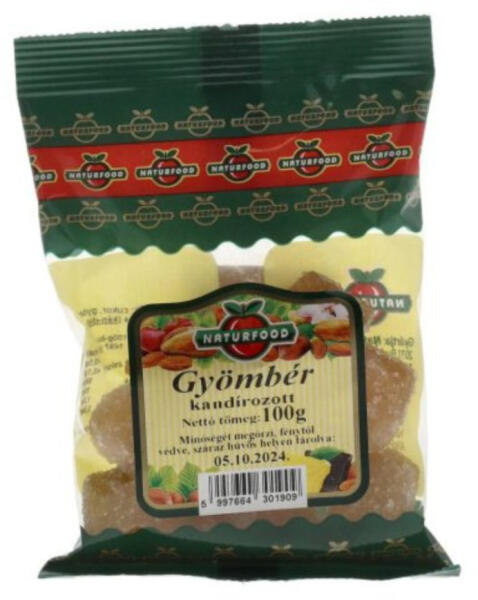 Naturfood kandírozott gyömbér 100g Összetevők: cukor, gyömbér, antioxidáns (kén-dioxid). A terméket magában fogyasztva vagy müzlik, sütemények készítéséhez, teák ízesítéséhez ajánljuk. Fénytől védett, száraz, hűvös helyen tárolandó. A termék kén-dioxidot tartalmaz és földimogyorót, dióféléket, szezámmagot felhasználó üzemben készült. Átlagos tápért