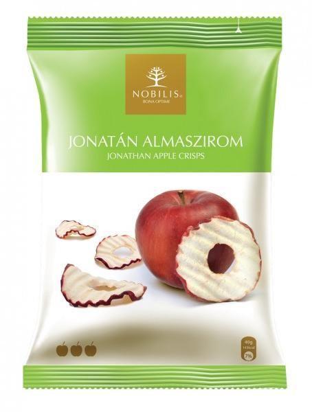 Szárított Jonatán alma karika. Összetevők: szárított Jonatán alma, antioxidáns: citromsav. 1 tasak (40g) tartalmaz: INBÉ(%) = Irányadó Napi Beviteli érték Energia 606kJ / 143kcal (7%) Fehérje 0,9g (2%) Szénhidrát 31,6 g (12%) Ebből cukrok 29,2 g (32%) Zsír 0,2 g ( Ebből telített zsírsavak Élelmi rost 5,9 g (24%) Nátrium RDA(%) = az ajánlott napi bevitel %-a B6-vitamin 0,1