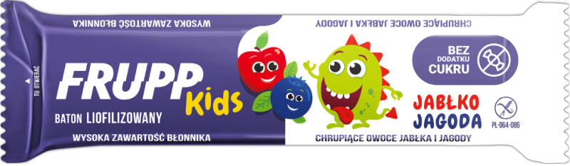 Frupp kids liofilizált szelet kék áfonya 10 g 100%-ban valódi, liofilizált (fagyasztva szárított) almából és kék áfonyából készült snack gyerekeknek. Gluténmentes, hozzáadott cukrot nem tartalmaz csak a gyümölcsökben természetesen előforduló cukrokat. Magas, 30% rosttartalommal. 1 szelet csak 34 kcal! Valódi almával és kék áfonya darabokkal. Ideális snack tízóraira,