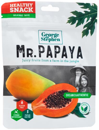 A Mr. Papaya egy ízletes, szárított papaja snack a gyümölcsök és az egzotikus ízek szerelmeseinek. Állaga a népszerű gumimaciéhoz hasonló, aromájában és ízében pedig a friss gyümölcsöt idézi. Remek választás gyors nassolnivalóként, az energiaraktárak feltöltésére.