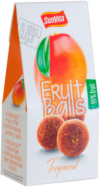 Sunvita trópusi gyümölcsgolyó mangópor borításban, mely 95% gyümölcstartalmú élelmi rost forrás. Nem tartalmaz hozzáadott cukrot, mesterséges aromát, édesítőszert és színezéket. Kizárólag a gyümölcsökben természetes módon előforduló cukrokat tartalmaz. Összetevők: datolyapaszta, mazsola, aszalt szilva (tartósítószer: kálium-szorbát), almatöret, növényi zsír