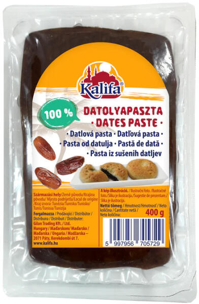 Kalifa datolya paszta 400 g Tudta, hogy a KALIFA datolya paszta klasszikus sütemények könnyen kezelhető és magas élvezeti értékű reform alapanyaga? Kellemesen édes ízét a szárított datolya természetes cukortartalmából nyeri. A termék kizárólag első osztályú datolya felhasználásával készül, amely jelentős vitamin- és ásványi anyag tartalmának köszönhetően nem csu