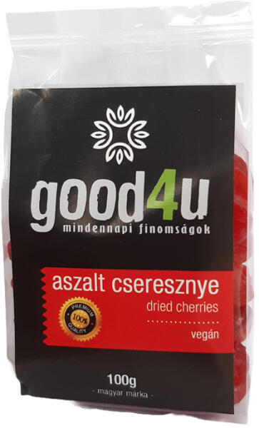 GOOD4U aszalt cseresznye 100 g Kifejezetten magas A-, C-vitamin-tartalma. Kiemelkedő a vastartalma, található benne kalcium, magnézium, kobalt is. Maga a cseresznye erősen tisztító hatású, jó az ízületekre. Összetevők: cseresznye 68%, nádcukor 31,9%, Kén dioxidot tartalmaz