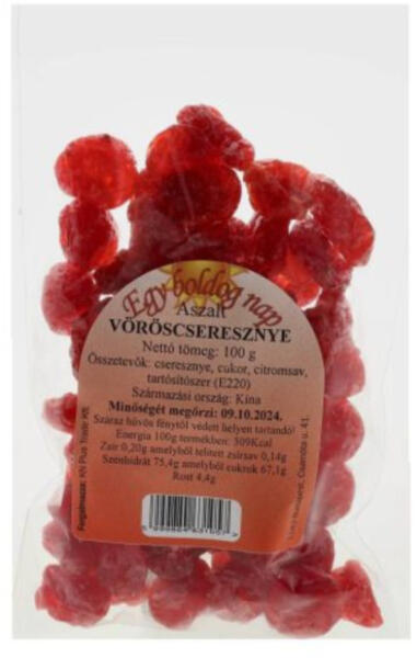 Egy boldog nap aszalt vöröscseresznye 100g Vitamin, ásványianyag- és nyomelem-tartalma mellett salaktalanító hatású is. Jelentős még a C-vitamintartalma is. A nyomelemek és ásványi anyagok közül a foszfor, nátrium és kálcium, kobalt tartalma említendő, elég sok káliumot, illetve vasat rejt.