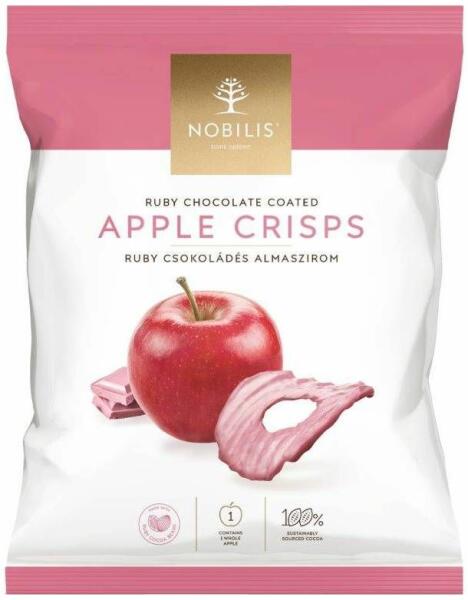 Ruby csokoládéval bevont szárított almaszirmok 1 tasak (50g) Ruby csokoládés almaszirom: 1 egész almát tartalmaz Természetes Rostforrás Összetevők: Ruby csokoládé (min. 60%) [cukor, kakaóvaj, zsíros tejpor, kakaómassza, emulgeálószer (szójalecitin)], antioxidáns: citromsav, természetes vanília aroma, ), jonatánalma, antioxidáns: citromsav. Átlagos tápérték 100 g termé