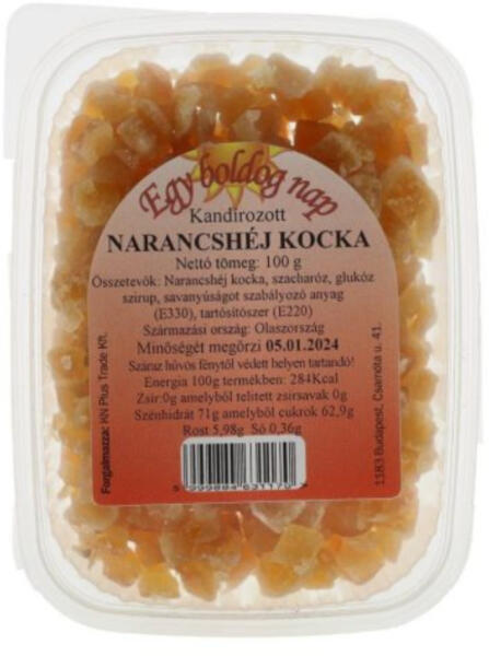 Egy boldog nap narancshéj kocka 100g A narancshéj intenzív aromája nem hiányozhat számos süteményből, desszertből, sőt, néhány koktélból sem. Egy boldog nap narancshéj kocka 100g A kandírozott narancshéjkockát használhatjuk sütemények ízesítésére. Tökéletesen illik a karácsonyi süteményekhez, jól passzol a kalácsokhoz, gyümölcskenyerekhez. Összetevők: narancsh
