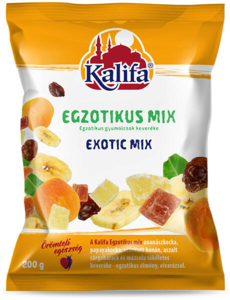 A Kalifa Egzotikus mix ananászkocka, papayakocka, szárított banánszeletek, aszalt magozott sárgabarack és mazsola tökéletes keveréke. Egzotikus élmény – elvarázsol… Termékelőnyök: Tápanyagok gazdag forrása: Az egzotikus mixben található ananász, papaya, banán, sárgabarack és mazsola gazdag forrásai vitaminoknak, ásványi anyagoknak és rostoknak, amelyek fontosak az eg
