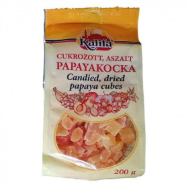 200 g-os kandírozott papaya kocka, Kalifa termék az egészséges élelmiszerek kedvelőinek. Aszalt papayakocka (kandírozott) Átlagos tápérték 100 g termékben: Energia: 1415 kJ/333 Kcal, zsír: 0,05 g -amelyből telített zsírsavak: 0,0 g, szénhidrát: 82 g -melyből cukor: 82,0 g, fehérje: 0,8 g, só: 0,133 g. Összetevők: 100% kandírozott aszalt papaya (papaya, nád cukor, citromsav