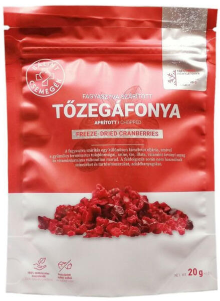 Bálint csemegék fagyasztva szárított tőzegáfonya aprított A fagyasztva szárítás egy különösen kíméletes eljárás, amivel a gyümölcs természetes tulajdonságai, színe, íze, illata, valamint ásványi anyag és vitamintartalma változatlan marad. A feldolgozás során nem használnak színezéket és tartósítószereket, adalékanyagokat. FOGYASZTÁSI JAVASLAT:natúr formában,