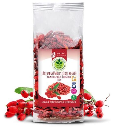 Cukor hozzáadása nélkül készült, ízletes aszalvány. Tények a goji bogyóról: 19 aminosavat (a fehérjék építőkövei) tartalmaz, melyek közül 8 esszenciális, azaz nélkülözhetetlen az élethez. 21 nyomelemet tartalmaz, köztük germániumot, amely ritkán fordul elő élelmiszerben és amely rákellenes hatású. Több fehérjét tartalmaz (13%), mint a teljes kiőrlésű gabona.