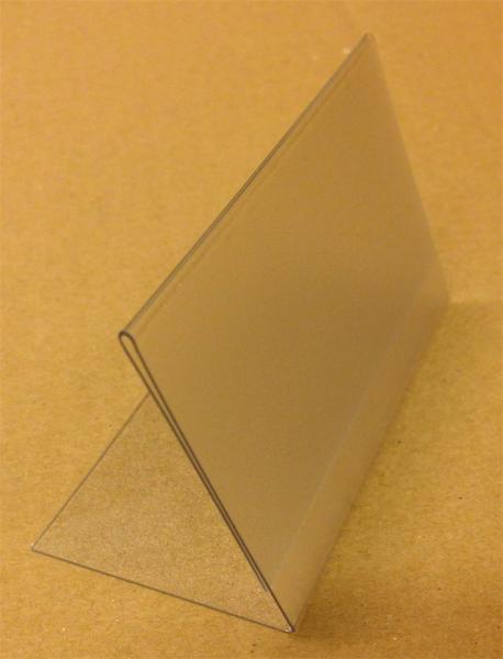 L alakú pultos prezentációs állványok plexiüvegből. Alkalmas állványként éttermi menükre. Álló tájolás. Egyoldalas nézet.