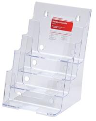 Prospektustartó A4-es méretű dokumentumokhoz asztali és fali kivitelben is. -beltéri használatra -ideális recepciós pultok, bemutatótermek vagy várótermek információs anyagaihoz -műanyag -álló A4-es dokumentumokhoz -áttetsző színben -bővíthető 6 kg teherbírásig -1 rekeszes -töltési kapacitás: 24 mm -asztali állványként is és falra rögzített kivitelben is használha